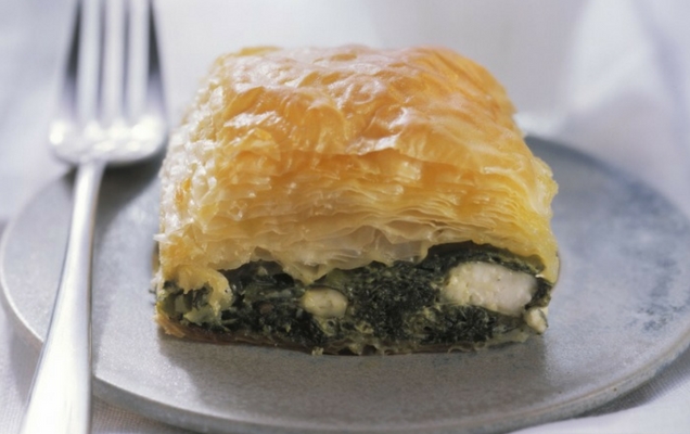 - Κόβετε με μαχαίρι τα περισσεύματα των φύλλων. Χαράζετε, αν θέλετε, την πίτα σε κομμάτια (χωρίς να φθάσει κάτω κάτω το μαχαίρι) και περνάτε το επάνω φύλλο με το υπόλοιπο λάδι και λίγο νερό. Ψήνετε την πίτα για 1 ώρα σε προθερμασμένο φούρνο στους 200 °C.