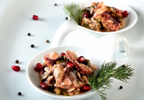 - Προσθέτετε το ρύζι και σιγοβράζετε για 16’, μέχρι να απορροφήσει τα υγρά του. Αποσύρετε από τη φωτιά, σκεπάζετε την κατσαρόλα και αφήνετε το φαγητό να «ηρεμήσει» γα 5’. Σερβίρετε σε 4 πιάτα και στολίζετε με λίγο ρόδι. Ραντίζετε με μερικές σταγόνες ελαιόλαδο.