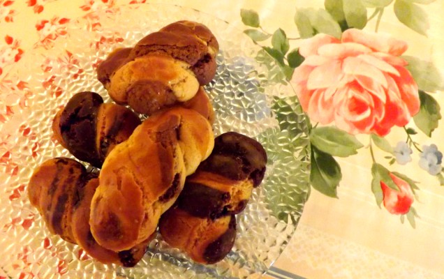 - Πλάθετε κορδόνια στο πάχος ενός δαχτύλου με την ανοιχτόχρωμη ζύμη και ίδιο αριθμό λίγο πιο λεπτά με τη ζύμη κακάο. Παίρνετε ανά δύο ένα χοντρό και ένα λεπτά και τα πλέκετε μεταξύ τους σε πλεξούδα. Τα κόβετε στο μήκος που θέλετε τα κουλουράκια σας και στρογγυλεύετε λίγο τις άκρες.