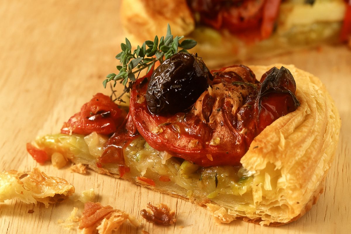 Συνταγή για ντοματόπιτα ξεσκέπαστη με σφολιάτα.
