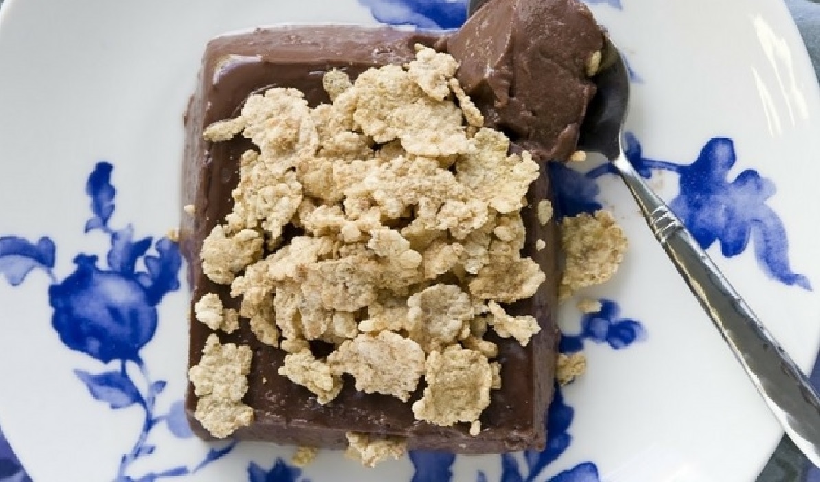 - Παίρνουμε ένα μικρό ταψάκι με διαστάσεις περίπου 20 x 25 εκ., το βρέχουμε κάτω από τη βρύση, το αδειάζουμε από το νερό και ρίχνουμε μέσα σε αυτό την κρέμα. (Το νερό βοηθάει να ξεκολλήσει έπειτα η κρέμα.). Καλύπτουμε με διάφανη μεμβράνη την επιφάνεια της κρέμας και τοποθετούμε στο ψυγείο για 2 ώρες, μέχρι να κρυώσει. Κόβουμε σε τετράγωνα κομμάτια και σερβίρουμε ρίχνοντας από πάνω τα κορν φλέικς (αν θέλουμε).