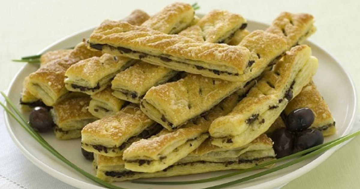 - Τοποθετείτε σε ορθογώνιο βουτυρωμένο ταψί το ένα φύλλο σφολιάτας, ώστε να καλυφτεί ο πάτος και λίγο τα πλαϊνά και απλώνετε εκεί το μείγμα με τις ελιές σε λεπτή στρώση. Καλύπτετε με το δεύτερο φύλλο σφολιάτας, το πιέζετε να κολλήσει καλά και το χαράζετε καλά σε μακρόστενες λωρίδες. Αλείφετε με το ασπράδι του αυγού και πασπαλίζετε με σουσάμι την επιφάνεια.