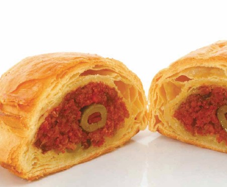 - Προθερμαίνετε το φούρνο σας στους 200 °C. Τοποθετείτε τη γέμιση με τις ελιές στο κέντρο του δίσκου και βάζετε στο κέντρο μια γεμιστή ελιά, πιέζοντας να βυθιστεί. Διπλώνετε τη σφολιάτα σε σχήμα μισοφέγγαρου. Πατάτε τις άκρες με βρεγμένα δάχτυλα για να κολλήσουν.