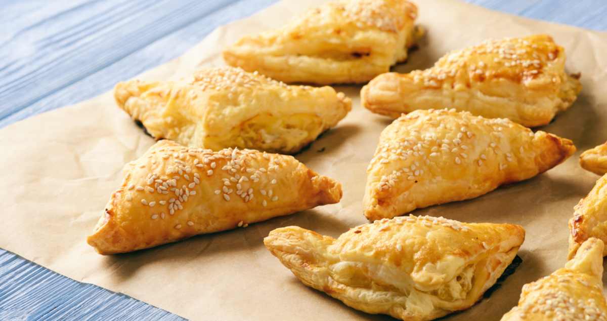 - Αλευρώνετε τον πάγκο της κουζίνας και τοποθετείτε τα στρογγυλά ή τετράγωνα σφολιατάκια, αφού τα ξεπαγώσετε. Παίρνετε μ’ ένα κουταλάκι λίγη γέμιση και τη βάζετε στο κέντρο της ζύμης, διπλώνετε κάθε σφολιατάκι σε σχήμα μισοφέγγαρου (αν είναι στρογγυλό) ή τριγώνου (αν είναι τετράγωνο) και πι.