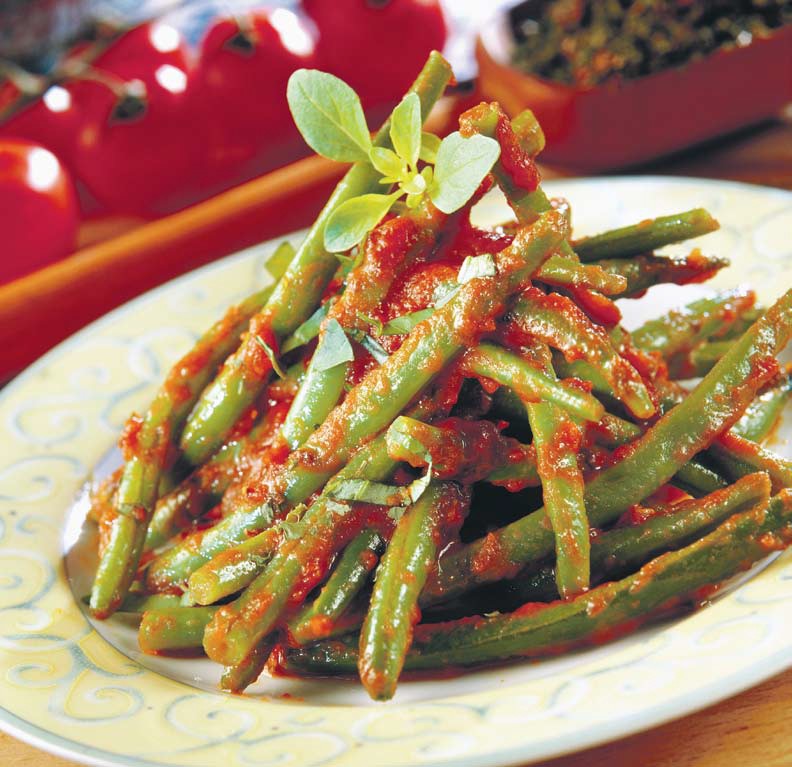 - Ζεματίζετε τα φασολάκια για 2’ σε καυτό νερό. Τα στραγγίζετε και τα αφήνετε στην άκρη. Ζεσταίνετε το λάδι σε κατσαρόλα και σοτάρετε το κρεμμύδι και το σκόρδο. Ρίχνετε την ψιλοκομμένη ντομάτα, τον ντοματοπολτό αραιωμένο σε 1½ φλιτζάνι νερό και κατόπιν τα φασολάκια.