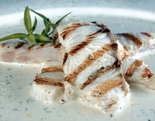 - Σε ένα καυτό αντικολλητικό τηγάνι ή σε σχάρα ρίχνετε τις φέτες του μαγιάτικου, αφού πρώτα τις έχετε αλείψει με λάδι και αλατίσει. Ψήνετε για 4’ από κάθε πλευρά. Σερβίρετε τη σάλτσα σε 4 πιάτα και από πάνω τοποθετείτε το ψάρι. Ραντίζετε με μερικές σταγόνες ελαιόλαδο.