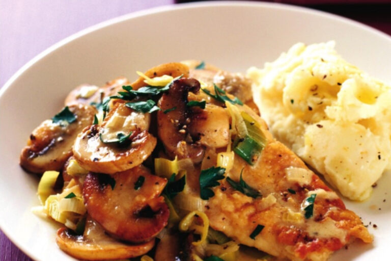 Συνταγή για φιλέτα κοτόπουλου με πράσα, μανιτάρια και πουρέ.