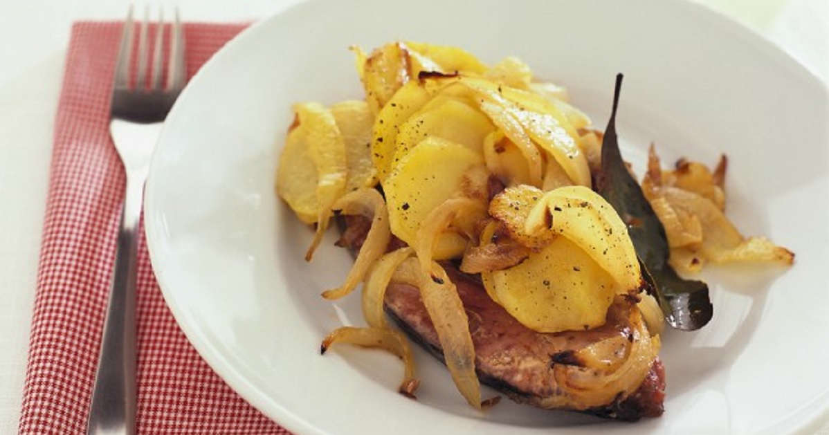 Συνταγή για φιλέτα τόνου μαριναρισμένα με μουστάρδα, συνοδευμένα με πατάτες και κρεμμύδια.