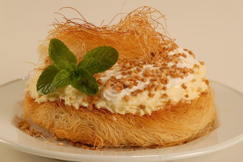 - Μόλις κρυώσει η φωλιά του καταΐφιού απλώνετε το γλυκό κυδώνι στη βάση της και γεμίζετε με την κρέμα. Γαρνίρετε με καραμελωμένα αμύγδαλα και φυλλαράκια δυόσμου.