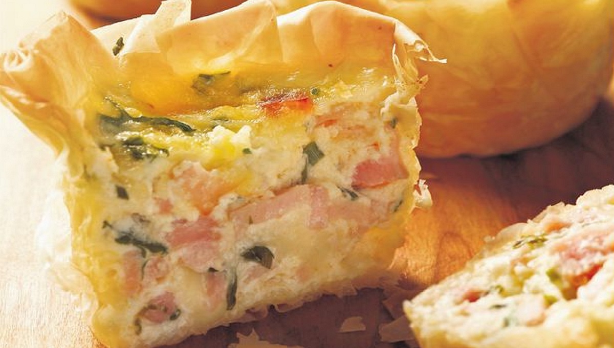 - Κόβετε κάθε φύλλο σε 4 τετράγωνα κοµµάτια. Παίρνετε 8 τσέρκια ή στρογγυλά ατοµικά φορµάκια και µέσα σε καθένα από αυτά βάζετε τα 4 τετράγωνα φυλλαράκια που κόψατε, βουτυρώνοντας ανάµεσα στα φύλλα και αφήνοντας τις άκρες τους να προεξέχουν.