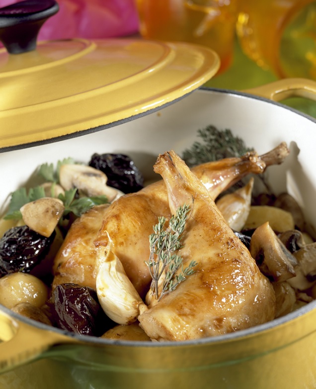 Ιδιαίτερο πιάτο για ιδιαίτερες στιγμές. Συνταγή για φραγκόκοτα μαγειρεμένη με δαμάσκηνα και μανιτάρια.