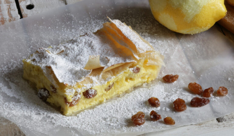 Συνταγή για γαλατόπιτα με σταφίδες και άρωμα λεμονιού