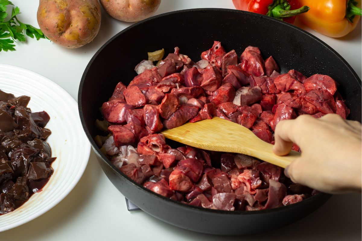 - Κόβετε τα εντόσθια με ψαλίδι καλά πλυμένο σε μικρότερα κομμάτια. Πλένετε καλά και τα έντερα μέσα-έξω (μπορείτε να τα ανοίξετε με το ψαλίδι για να τα πλύνετε ευκολότερα).