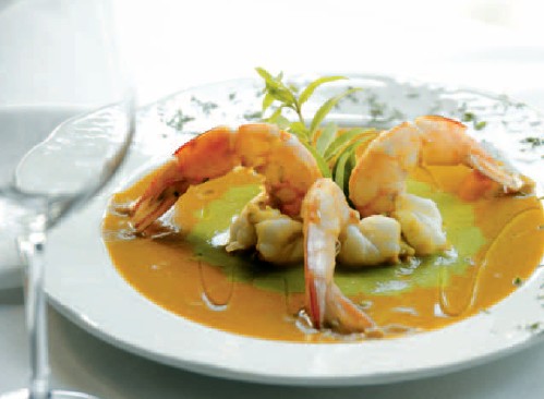 - Στην κατσαρόλα, όπου έχει μείνει ο υπόλοιπος αρακάς, ρίχνετε τη σάλτσα ντομάτας και βράζετε για 5΄ ακόμα. Προσθέτετε τις γαρίδες, αλατοπιπερώνετε ελαφρά και από τις δύο πλευρές και τις βράζετε για 3΄. Αφαιρείτε τις γαρίδες και τον αστεροειδή γλυκάνισο από τον αρακά, περνάτε τον κοκκινιστό αρακά μαζί με 150 ml ζωμό καραβίδας από το μπλέντερ και από ψιλή σήτα.