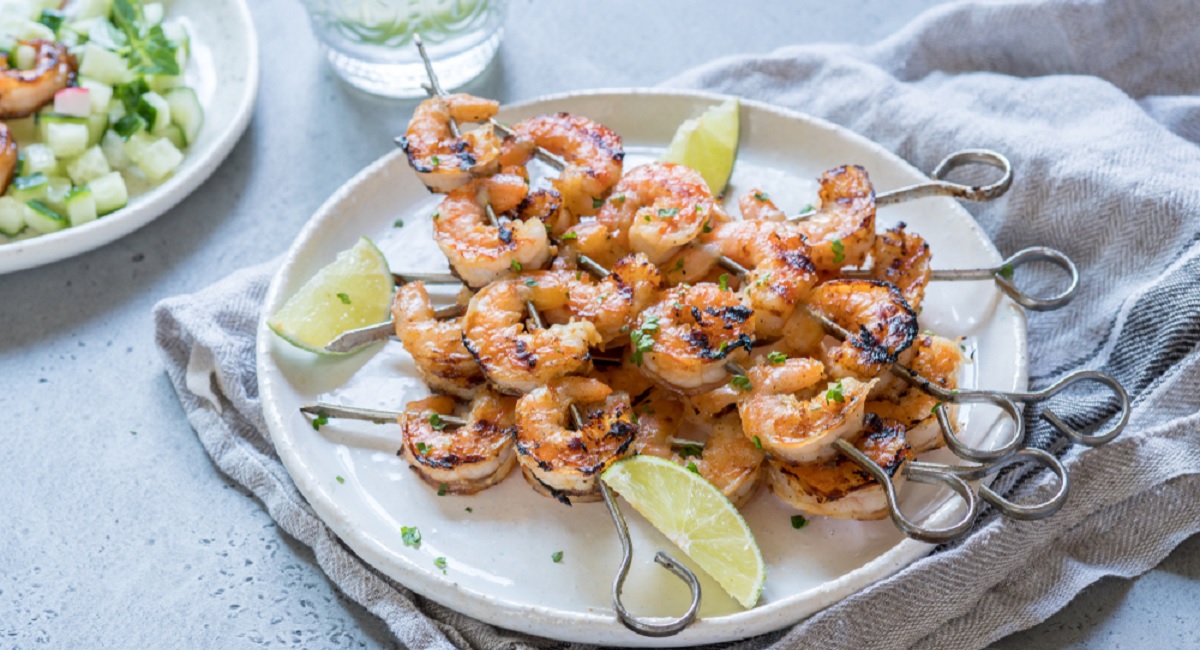 - «Διπλώνετε» τις γαρίδες στα δύο και τις περνάτε ανά 4-5 σε μεταλλικά σουβλάκια, έτσι ώστε να πιαστούν σε δύο σημεία (ψηλά στη ράχη και στη μέση της ουράς).