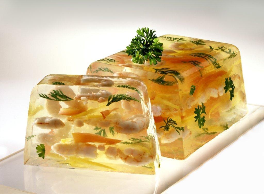 - Σουρώνετε σε τουλπάνι, ρίχνετε στον φιλτραρισμένο ζωμό τα 4 φύλλα ζελατίνης ή 11-12 γρ. σκόνη και αφήνετε να κρυώσει. Ρίχνετε λίγο από το μείγμα ζελατίνης σε μια μακρόστενη φόρμα. Αφήνετε στο ψυγείο να παγώσει και να πήξει. Βάζετε κατόπιν λεπτές φέτες πιπεριάς, φυλλαράκια από άνηθο ή κόλιανδρο και μερικές γαρίδες και προσθέτετε με προσοχή λίγο ζελέ.
