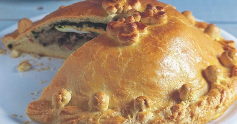 - Απλώνετε το ένα φύλλο σφολιάτας σε βουτυρωµένο στρογγυλό ταψί. Ρίχνετε µέσα τη γέµιση µε το κρέας µε τέτοιο τρόπο ώστε να σχηµατίζει ένα λοφάκι και απλώνετε τις πιπεριές ώστε να καλύψουν τη γέµιση. Τη σκεπάζετε µε το δεύτερο φύλλο. Στολίζετε την πίτα µε κορδόνι που θα φτιάξετε µε τα περισσεύµατα της σφολιάτας. Αλείφετε µε βούτυρο και αυγό και την ψήνετε στο φούρνο για 35’-40’ περίπου, µέχρι να ροδίσει.