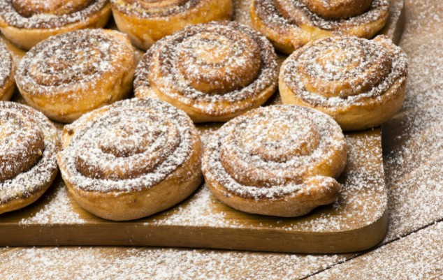 - Ανοίγετε τη ζύμη σε τετράγωνο φύλλο και ρίχνετε από πάνω το υπόλοιπο βουτύρο σε κομματάκια. Πασπαλίζετε με την καστανή ζάχαρη, την κανέλα, τα καρύδια και τις σταφίδες. Την τυλίγετε σε όχι πολύ σφιχτό ρολό. Κόβετε σε φέτες.