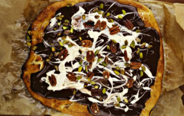 - Απλώνετε τη σπιτική μερέντα στη ψημένη βάση για πίτσα, περιχύνετε με τη λευκή σοκολάτα και γαρνίρετε με τους ξηρούς καρπούς.