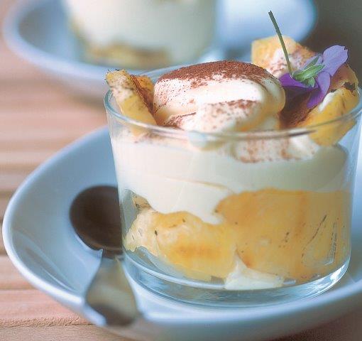 - Μοιράζετε σε 6 ποτήρια τα μισά από τα κομμάτια του ανάνα. Γεμίζετε τα ποτήρια με την κρέμα τυριού χρησιμοποιώντας, αν θέλετε, κορνέ ζαχαροπλαστικής και γαρνίρετε από πάνω με τα υπόλοιπα κομμάτια ανάνα. Πασπαλίζετε με λίγο κακάο κοσκινισμένο.