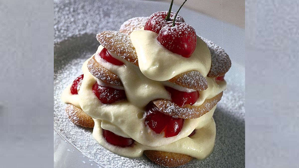 - Βάζετε σε κάθε πιάτο 2-3 μπισκότα, από πάνω βάζετε μια στρώση κρέμας, σκορπίζετε μερικά κεράσια και συνεχίζετε με τον ίδιο τρόπο βάζοντας μπισκότα, κρέμα και κεράσια μέχρι να τελειώσουν τα υλικά.