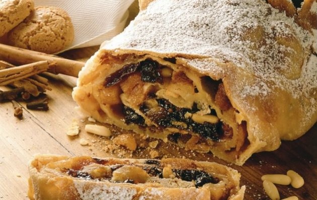 - Τοποθετείτε τα ξερά φρούτα και τα φρουί γλασέ (αν βάλετε) πάνω στο μείγμα της γαλέτας και πασπαλίζετε με τη ζάχαρη και την κανέλα. Τυλίγετε το φύλλο σε ρολό, κολλάτε τις άκρες με λίγο νερό και αλείφετε την επιφάνεια με το υπόλοιπο βούτυρο. Βάζετε το ρολό σε βουτυρωμένο ταψί και ψήνετε στους 200° C, 40’. Αφήνετε να κρυώσει λίγο και πασπαλίζετε με άχνη ζάχαρη. Το σερβίρετε κομμένο σε φέτες.