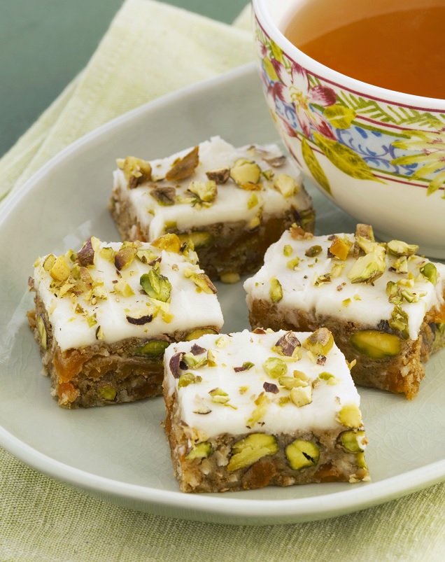 - Αδειάζετε το μείγμα στη φόρμα και το πιέζετε με μια σπάτουλα να ισιώσει. Ψήνετε το γλυκό για 30' - 35'. Αφήνετε να κρυώσει μέσα στη φόρμα, ξεφορμάρετε και πασπαλίζετε με άχνη ζάχαρη ή αλείφετε με λευκό γλάσο και πασπαλίζετε με φιστίκια.