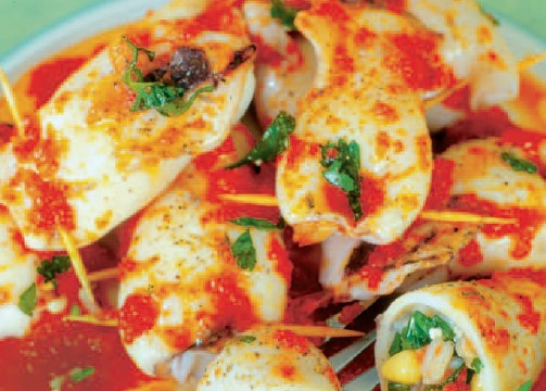 - Προσθέτετε τα μισά ντοματάκια και βράζετε για 3’ - 4’ ακόμη. Αφήνετε το μείγμα να κρυώσει και προσθέτετε τη φέτα, την κεφαλογραβιέρα και το κουκουνάρι. Γεμίζετε τα καλαμάρια με το μείγμα και τα τοποθετείτε σε μικρό ταψάκι.
