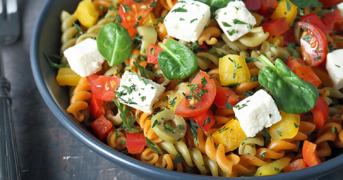 Συνταγή για καλοκαιρινή σαλάτα με βίδες, ντομάτα, φέτα και βασιλικό