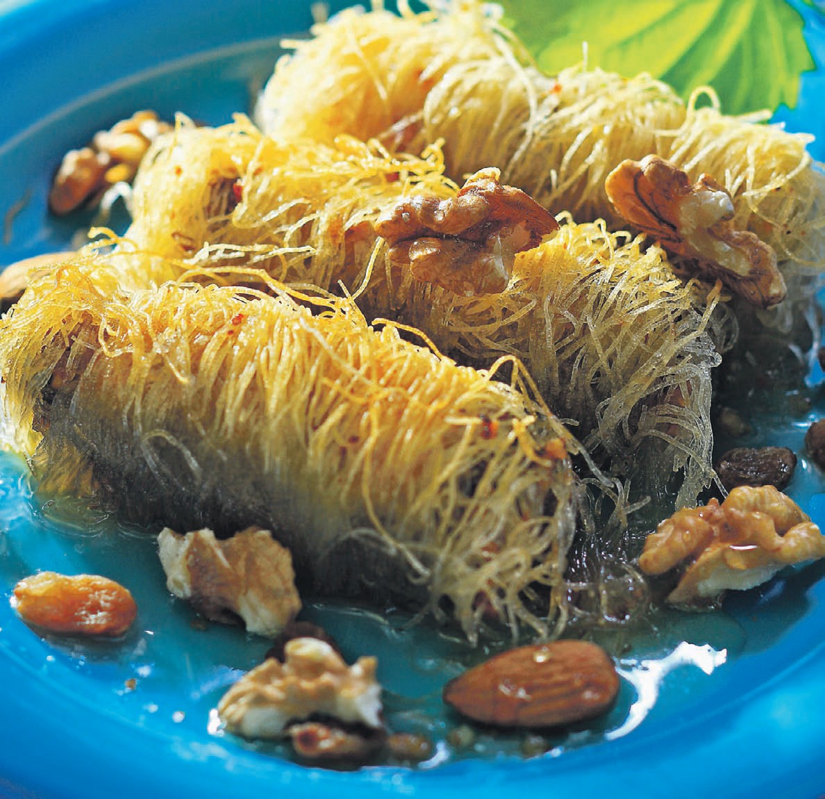 - Τοποθετείτε μια μικρή ποσότητα από το μείγμα πάνω σε κάθε τούφα καταϊφιού (στην μία άκρη) και τυλίγετε σε ρολά. Τοποθετείτε σε ρολά σε ταψί το ένα κοντά στο άλλο. Περιχύνετε με το υπόλοιπο βούτυρο. Ψήνετε στους 180°C για περίπου 45' μέχρι να αρχίσουν να παίρνουν χρώμα.