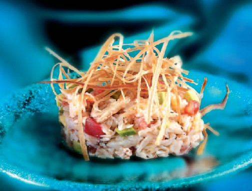 - Ετοιμάζετε τη σαλάτα (βάζοντας σε ένα μπολ το καβούρι μαζί με το αβοκάντο, το λεμόνι, αλάτι, πιπέρι, ντομάτα, ελαιόλαδο) και ανακατεύετε καλά. Μοιράζετε τη σαλάτα σε 4 τσέρκια και τη βάζετε σε 4 πιάτα. Ραντίζετε με μερικές σταγόνες ελαιόλαδο βανίλιας και από πάνω γαρνίρετε με το τηγανητό πράσο.