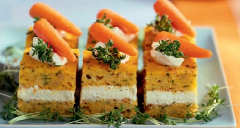 - Χτυπάτε το ανθότυρο με πιρούνι για να αφρατέψει. Απλώνετε το ανθότυρο ή το κατίκι σε μια καλή στρώση πάνω στο «παντεσπάνι» και καλύπτετε με το δεύτερο ψημένο «παντεσπάνι». Αφήνετε στο ψυγείο για 2 ώρες και κόβετε σε ορθογώνια κομμάτια. Γαρνίρετε με καροτάκια baby σοτέ.