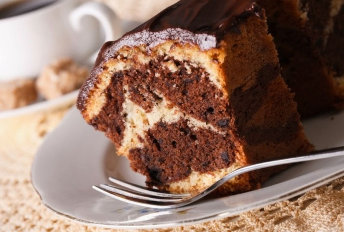 - Αν θέλετε, βυθίζετε ελαφρά ένα ξυλάκι και το κουνάτε μέσα στη ζύμη του κέικ για να κάνετε «νερά» -τη λεγόμενη «υφή μάρμαρου». Προσέχετε όμως να μην πάει παντού η ζύμη με το κακάο, γιατί θα γίνει όλο το κέικ καφέ. Ψήνετε το κέικ στους 180° C για 60' ή ανάλογα με το φούρνο σας.