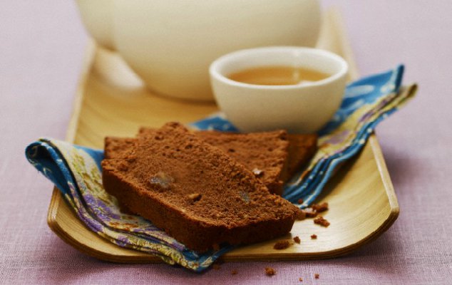 - Προσθέτετε στο προηγούμενο μείγμα τα χτυπημένα αυγά και κατόπιν το κρύο τσάι και ανακατέυετε με ξύλινη κουτάλα μέχρι να ομογενοποιηθούν τα υλικά. Ρίχνετε το μείγμα στη φόρμα, ισιώνετε την επιφάνεια και ψήνετε 1 ώρα. Αφήνετε το κέικ να κρυώσει 10’, πριν το ξεφορμάρετε.