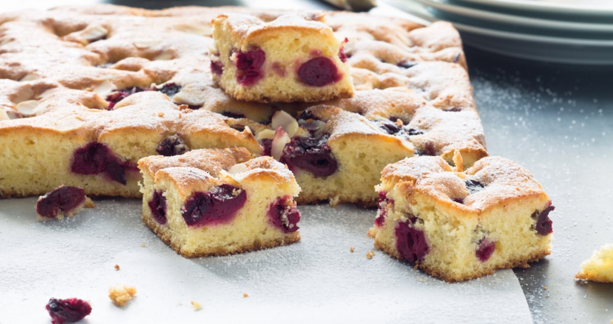 - Απλώνετε τα κεράσια σε βουτυρωμένη, αντικολλητική, παραλληλόγραμμη ή τετράγωνη φόρμα (πλευράς 22cm-24cm) και στη συνέχεια ρίχνετε το μείγμα του κέικ. Κουνάτε το σκεύος ή βοηθάτε με τη σπάτουλα να απλωθεί παντού καλά. Ψήνετε σε προθερμασμένο φούρνο στους 180° C για 35'-40'. Σερβίρετε το κέικ πασπαλισμένο με άχνη.