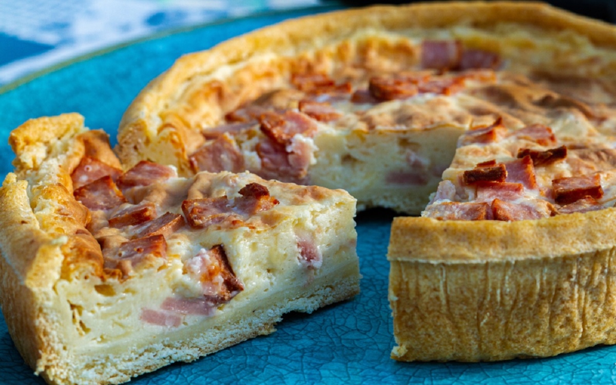 Συνταγή για αλμυρή τάρτα με καπνιστό χοιρινό και τυριά, ιδανική για ένα κρασί -λευκό, όξινο και πληθωρικό, κατά προτίμηση.