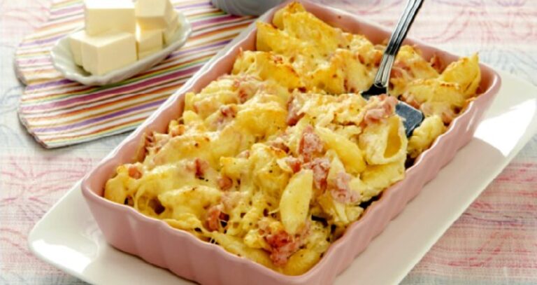 - Βάζουμε τα ζυμαρικά σε πυρίμαχο σκεύος ή ταψί που έχουμε αλείψει με λίγο βούτυρο. Προσθέτουμε τα τριμμένα τυριά, το μπέικον, το βούτυρο σε κύβους και αλατοπιπερώνουμε.