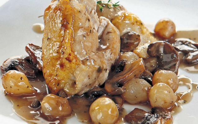 - Αλατοπιπερώνετε τις μερίδες του πουλερικού. Ζεσταίνετε το λάδι σε κατσαρόλα και ροδίζετε τις μερίδες και από τις δυο πλευρές. Τις βγάζετε από την κατσαρόλα και ρίχνετε μέσα τα κρεμμυδάκια, τα μανιτάρια και το σκόρδο. Ρίχνετε λίγο αλάτι και πιπέρι και σοτάρετε για 4΄-5΄ανακατεύοντας.