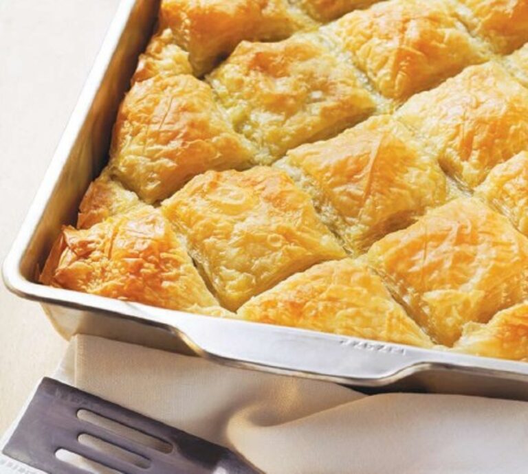 - Από πάνω βάζετε τα υπόλοιπα φύλλα, επίσης βουτυρωμένα. Στο προτελευταίο φύλλο αλείφετε με το πέμπτο αυγό χτυπημένο για να πάρει η πίτα όμορφο χρώμα. Τη χαράζετε και ψήνετε για 45΄ στους 180-200 °C.