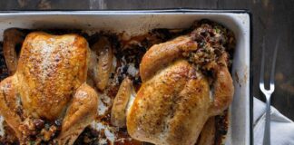 Κοτόπουλο γεμιστό με ρύζι, συκωτάκια, σταφίδες και κουκουνάρι