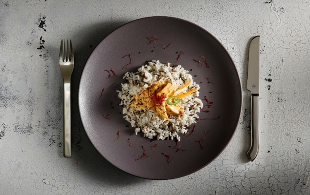 - Διαλύετε τον κρόκο σε λίγο ζεστό νερό και τον αφήνετε μέσα για 20'. Ζεσταίνετε το λάδι μεγάλη βαθιά κατσαρόλα και ροδίζετε τις μπουκιές του κοτόπουλου. Χαμηλώνετε λίγο τη θερμοκρασία, αφαιρείτε το κοτόπουλο, προσθέτετε τα κρεμμύδια και τα σοτάρετε μέχρι να μαλακώσουν. Προσθέτετε το σκόρδο και ανακατεύετε για ένα λεπτό ακόμη.
