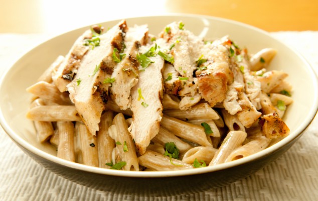- Περιχύνετε τη σάλτσα στα μακαρόνια και ανακατεύετε. Σερβίρετε τα ζυμαρικά, τοποθετείτε από πάνω τις φέτες κοτόπουλου και πασπαλίζετε αν θέλετε με παρμεζάνα.