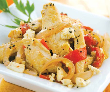 - Κόβετε το κοτόπουλο σε λεπτές λωρίδες. Καθαρίζετε τα κρεμμύδια και τα κόβετε σε ροδέλες. Στραγγίζετε τις πιπεριές και τις κόβετε σε λεπτές λωρίδες.