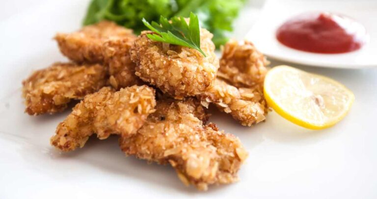 - Περνάτε τους κύβους του κοτόπουλου διαδοχικά, πρώτα από το αλεύρι, τινάζοντας να φύγει το επιπλέον, κατόπιν από το αυγό και τέλος από το μείγμα βρώμης, γυρίζοντάς τους από όλες τις πλευρές. Τοποθετείτε το παναρισμένο κοτόπουλο σε ταψί στρωμένο με λαδόχαρτο και το αφήνετε στο ψυγείο για 1-2 ώρες.
