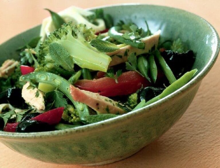- Ζεματίζετε το μπρόκολο και τα φασολάκια για 7'-8' σε βραστό, αλατισμένο νερό και τα στραγγίζετε. Τα αφήνετε να κρυώσουν και τα ρίχνετε σε μπολ. Προσθέτετε το κοτόπουλο κομμένο σε λωρίδες , την πιπεριά, τις φέτες ντομάτας, τα φυλλαράκια μαϊντανού και αλατοπίπερο. Ανακατεύτε τα υλικά προσεκτικά.