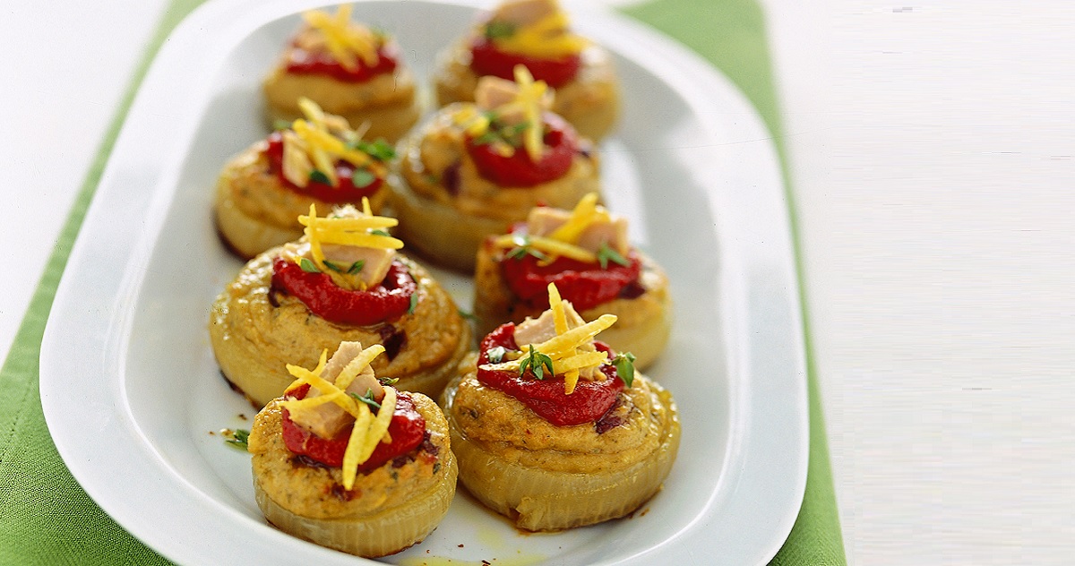 - Καθαρίζετε προσεκτικά τα κρεμμύδια για να μη χαλάσετε το σχήμα τους και τα βράζετε 15΄σε αλατισμένο νερό. Αναμειγνύετε τα φρέσκα κρεμμυδάκια, το ψωμί, το μισό θυμάρι, τη ρίγανη, την κάππαρη, το σκόρδο, τα 2/3 από τον τόνο κομματιασμένο, το πεκορίνο τριμμένο, το αυγό, αλάτι και πιπέρι και ζυμώνετε αυτό το μείγμα.