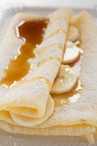 - Αλείφετε κάθε κρέπα με λίγο μέλι, κόβετε σε ροδέλες τις μπανάνες, τις απλώνετε πάνω σε κάθε κρέπα διπλώνετε τις κρέπες στα τέσσερα, τις περιχύνετε με το υπόλοιπο μέλι και τις πασπαλίζετε με άχνη.