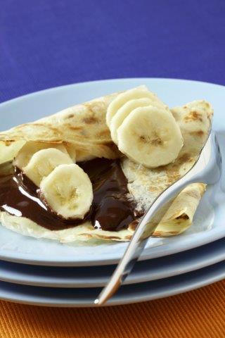 - Αλείφετε κάθε κρέπα με τη σοκολάτα, κόβετε σε ροδέλες τις μπανάνες, τις απλώνετε πάνω σε κάθε κρέπα διπλώνετε τις κρέπες στα τέσσερα και τις πασπαλίζετε με αμύγδαλα καβουρντισμένα (προαιρετικά).
