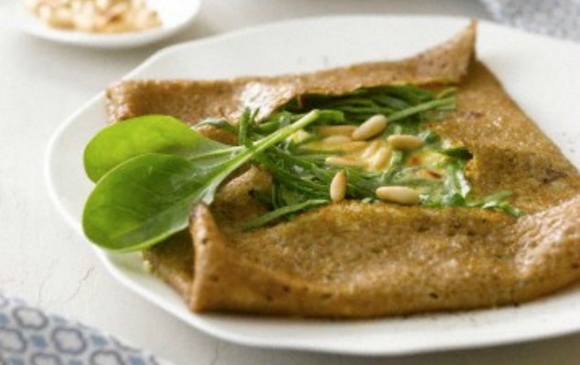 - Τοποθετείτε τις κρέπες σε βουτυρωμένο ταψί τη μια δίπλα στην άλλη. Ψήνετε τις κρέπες για 35΄στους 180 °C μέχρι να ροδίσουν. Πασπαλίζετε προαιρετικά με το κουκουνάρι και τις σερβίρετε.