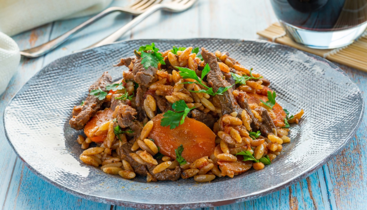 Συνταγή για κριθαράκι με κρέας μαγειρευτό, ένα γιουβέτσι κατσαρόλας